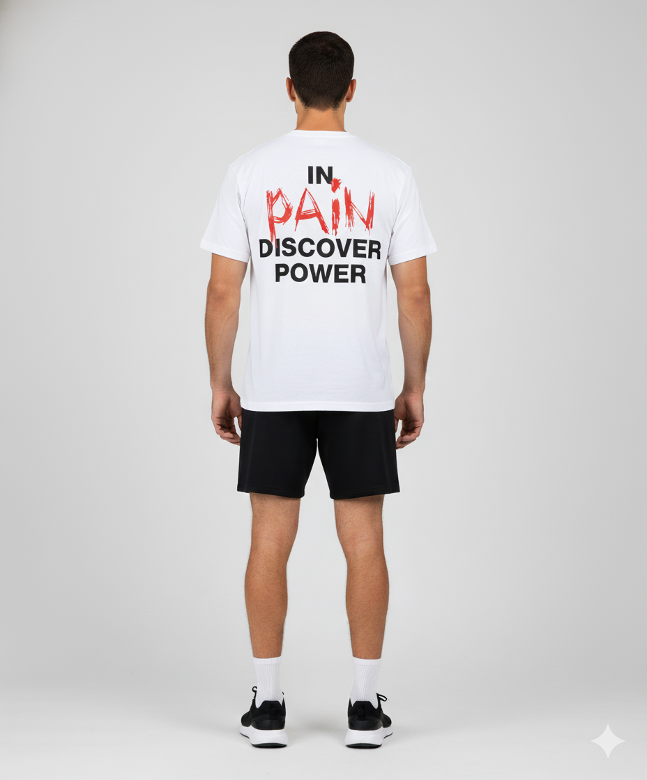 Camiseta regular fit con ajuste muscle en color blanco, confeccionada en tejido elástico que se adapta al cuerpo. Gráfica trasera con el mensaje “IN PAIN DISCOVER POWER”, con PAIN en tipografía roja desgarrada que transmite crudeza y fuerza.