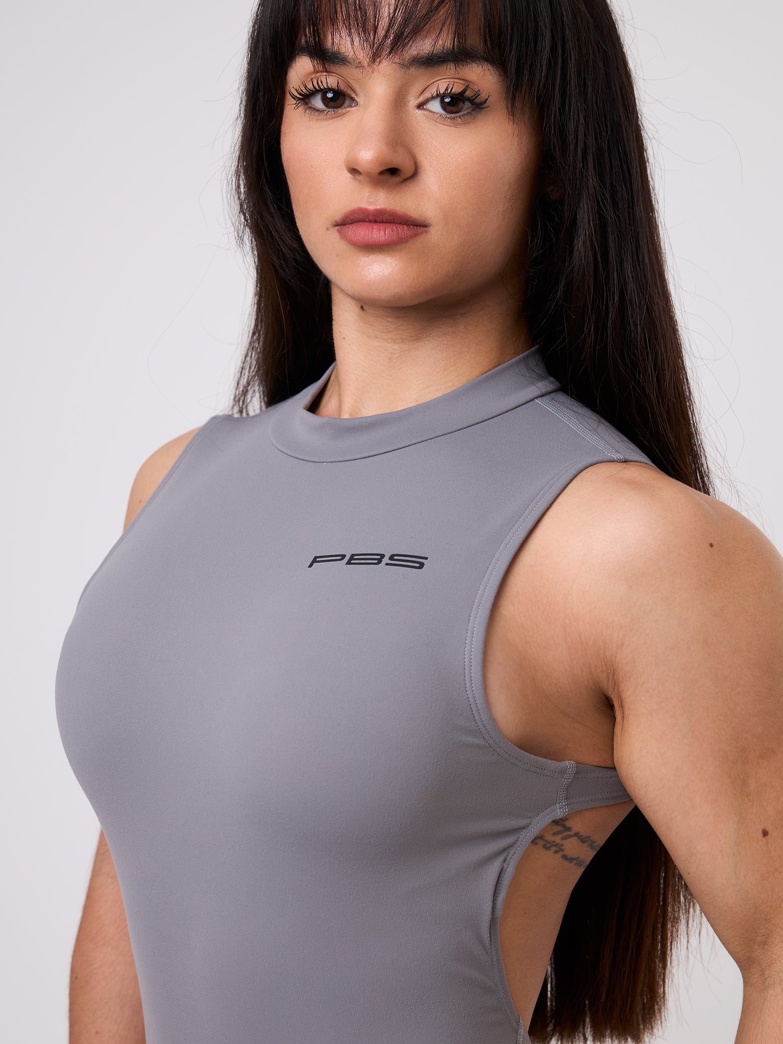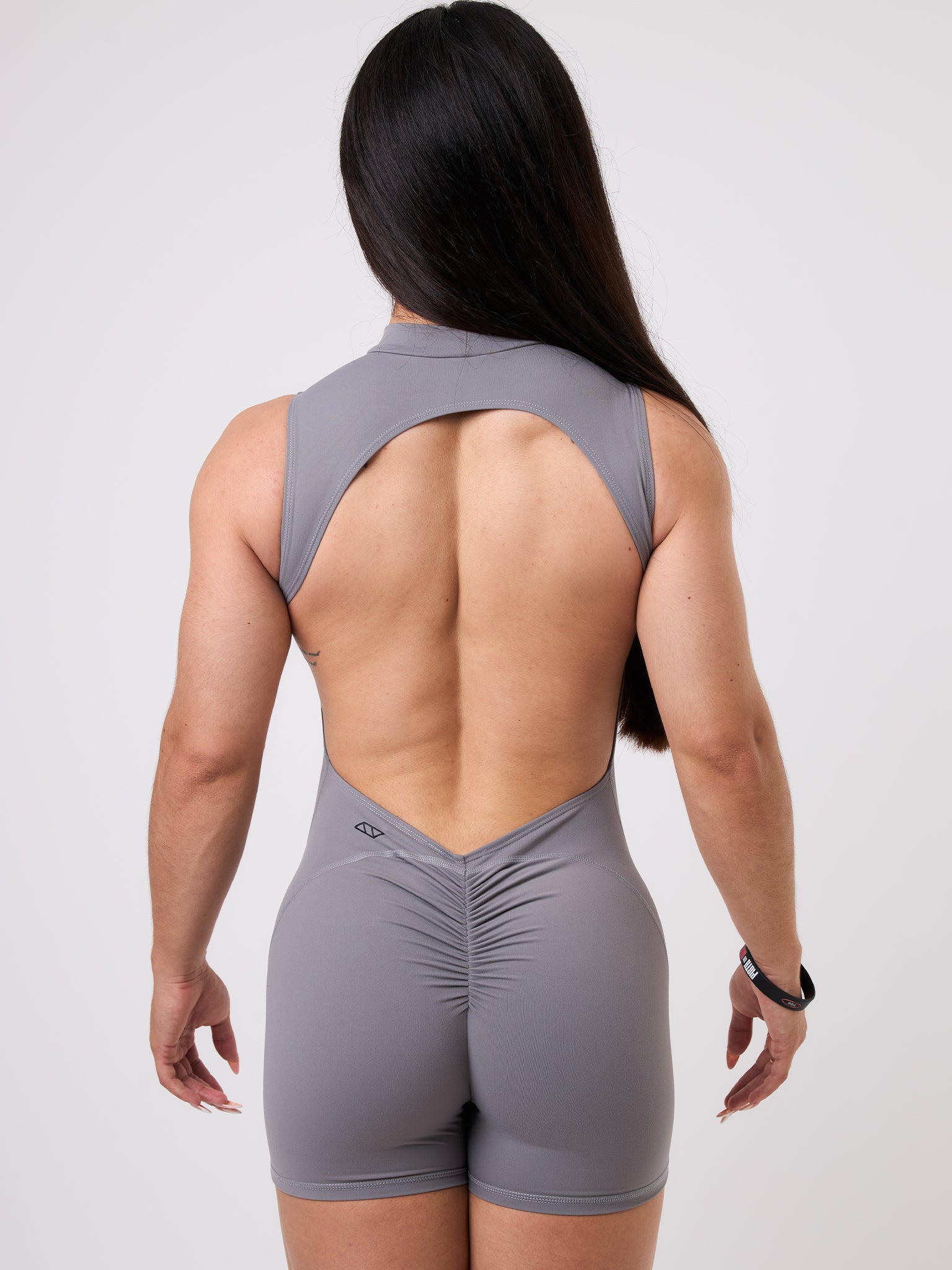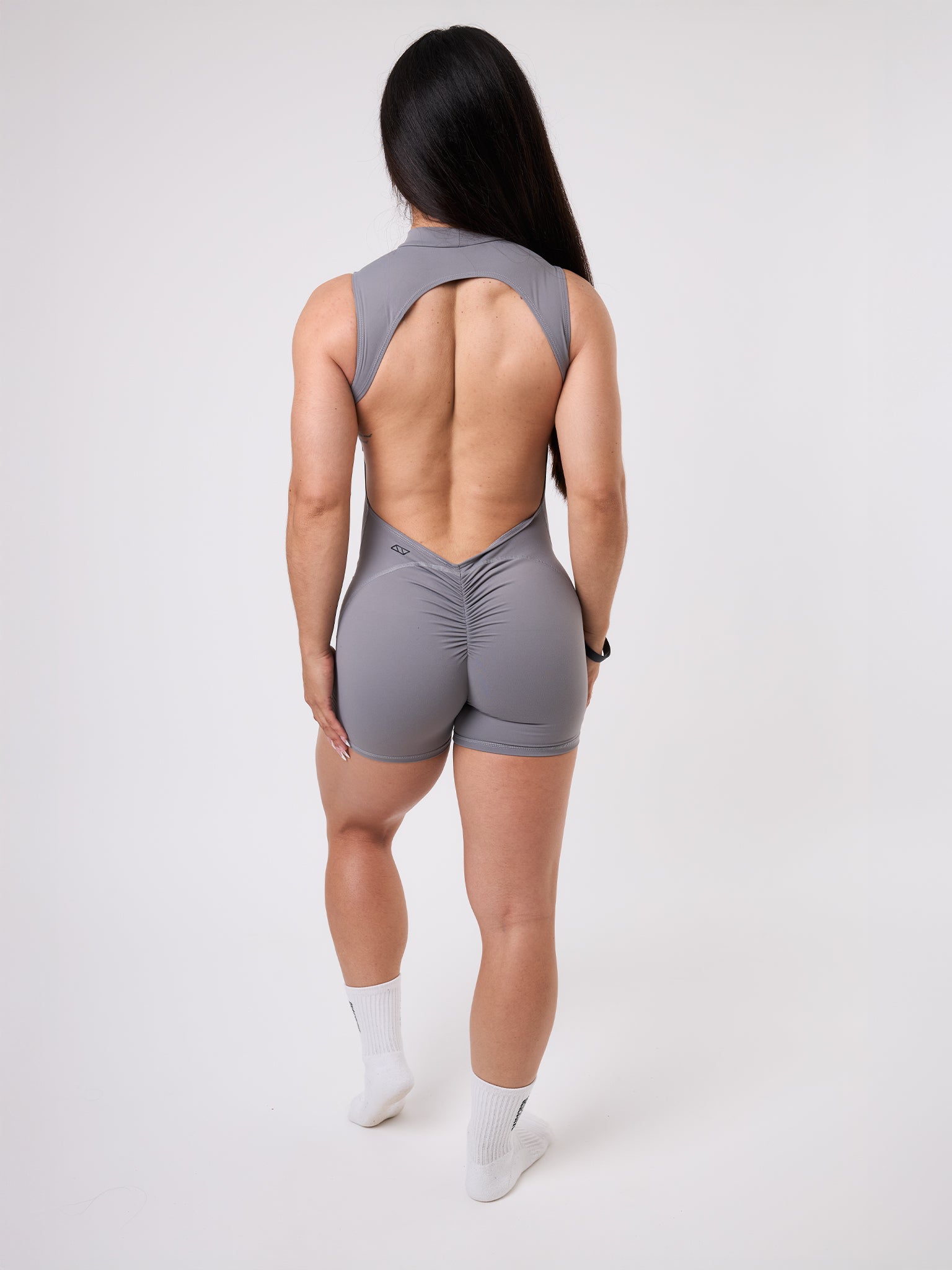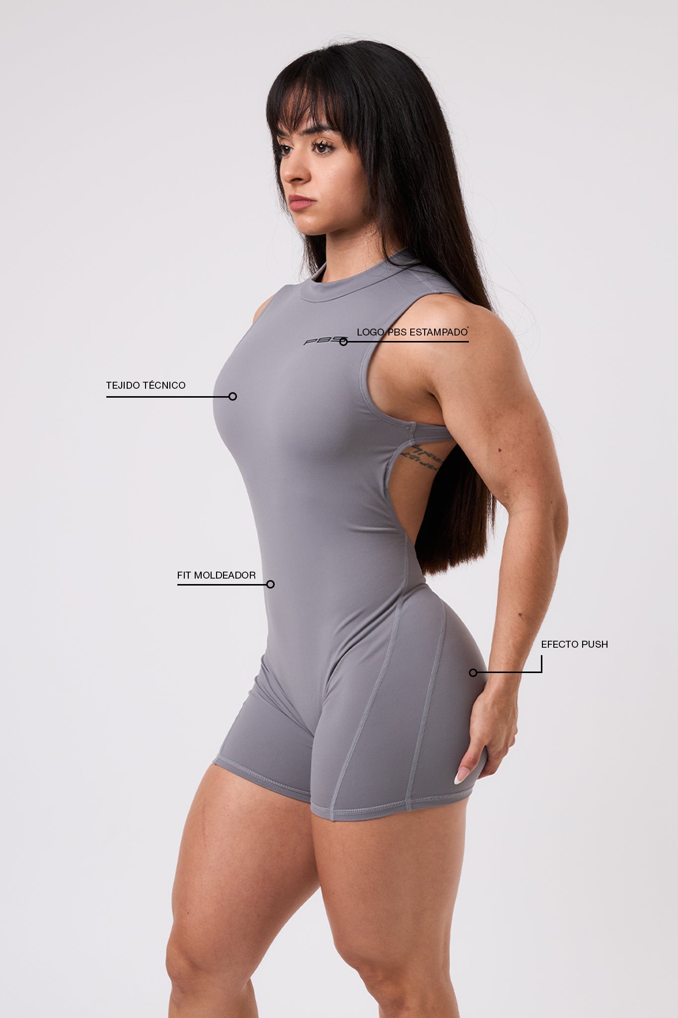 Jumpsuit de PBS en color gris hecho de material técnico, elástico y resistente. Su parte frontal ofrece un estilo sobrio y atlético, mientras que la espalda completamente descubierta con corte en V.