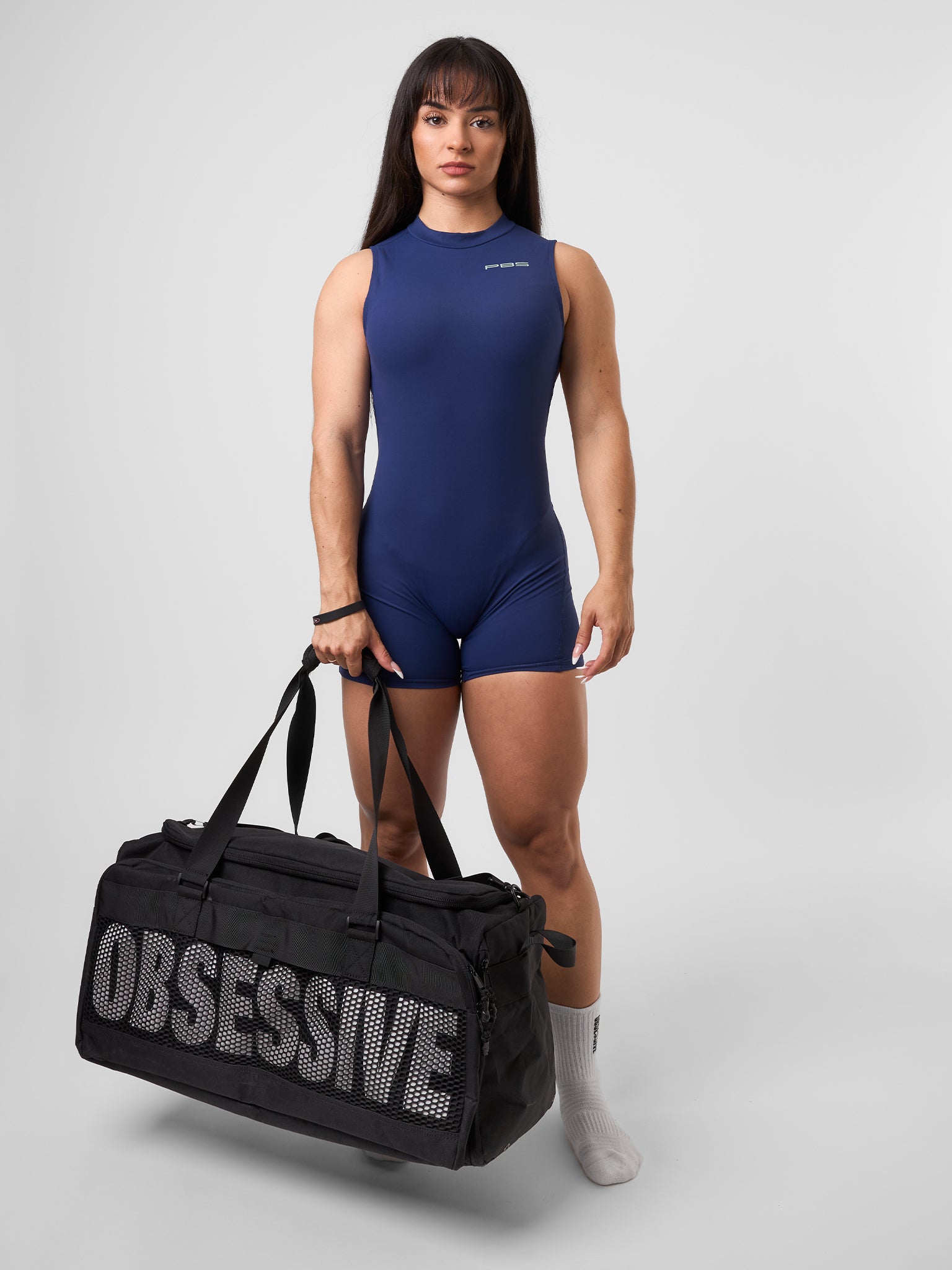 Jumpsuit de PBS en color azul marino navy hecho de material técnico, elástico y resistente. Su parte frontal ofrece un estilo sobrio y atlético, mientras que la espalda completamente descubierta con corte en V.