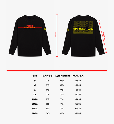 Camiseta de manga larga en color negro y amarillo con alto gramaje con una de las frases de la nueva colección "Stay Relentless". Se trata de una camiseta con fit oversize, ideal para el entreno o post entreno debido a su comodidad.