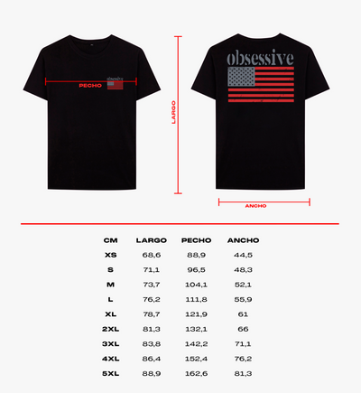 Camiseta regular fit color negro con diseño obsessive renovado con la bandera de USA. Contenido diseño en la parte frontal y en la parte trasera con la bandera de USA y la palabra "OBSESSIVE"