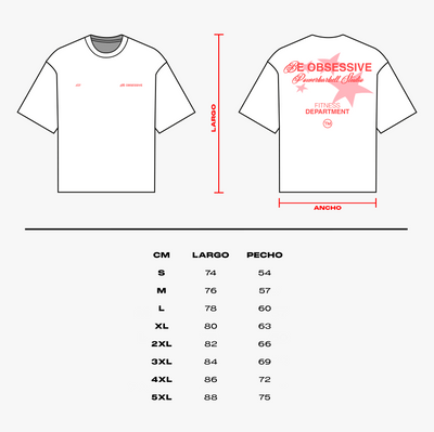 Nuevo modelo de camiseta ligeramente holgada de Powerbarbell Studio en color blanco. Destaca el detalle de las estrella estilo vintage en la parte de la espalda y la frase "Be Obsessive" y con todos los detalles en color rojo.