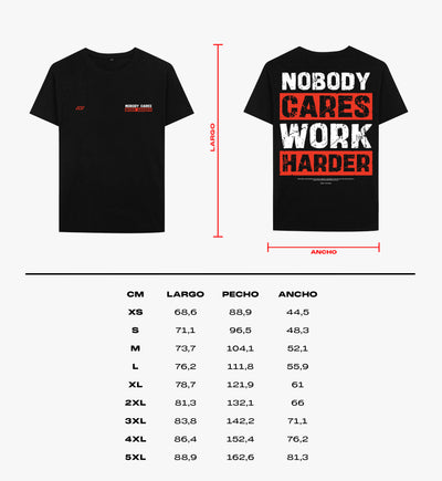 El mensaje “Nobody Cares, Work Harder” impreso en tipografía desgastada y bloques rojos transmite actitud y resiliencia.