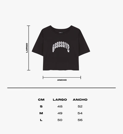 Camiseta oversized cropped color negro con el logotipo frontal de OBSESSIVE. Incluye detalles como una etiqueta de PBS tejida en la parte trasera en el cuello y acabados sin costuras.