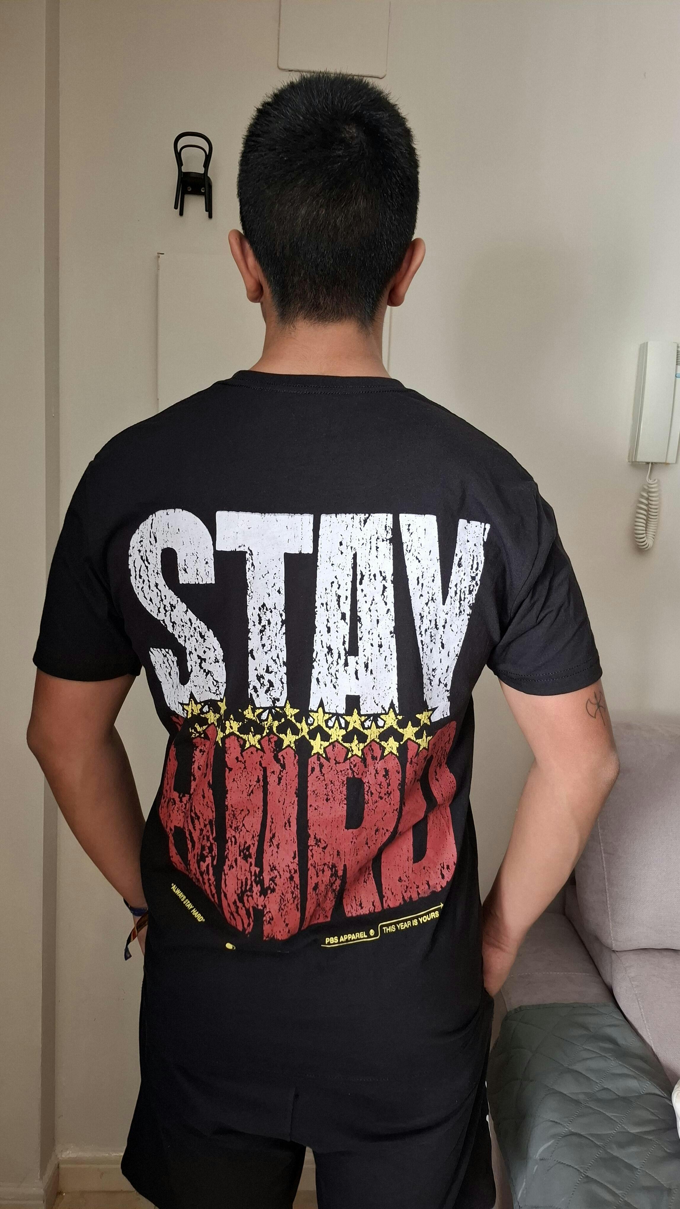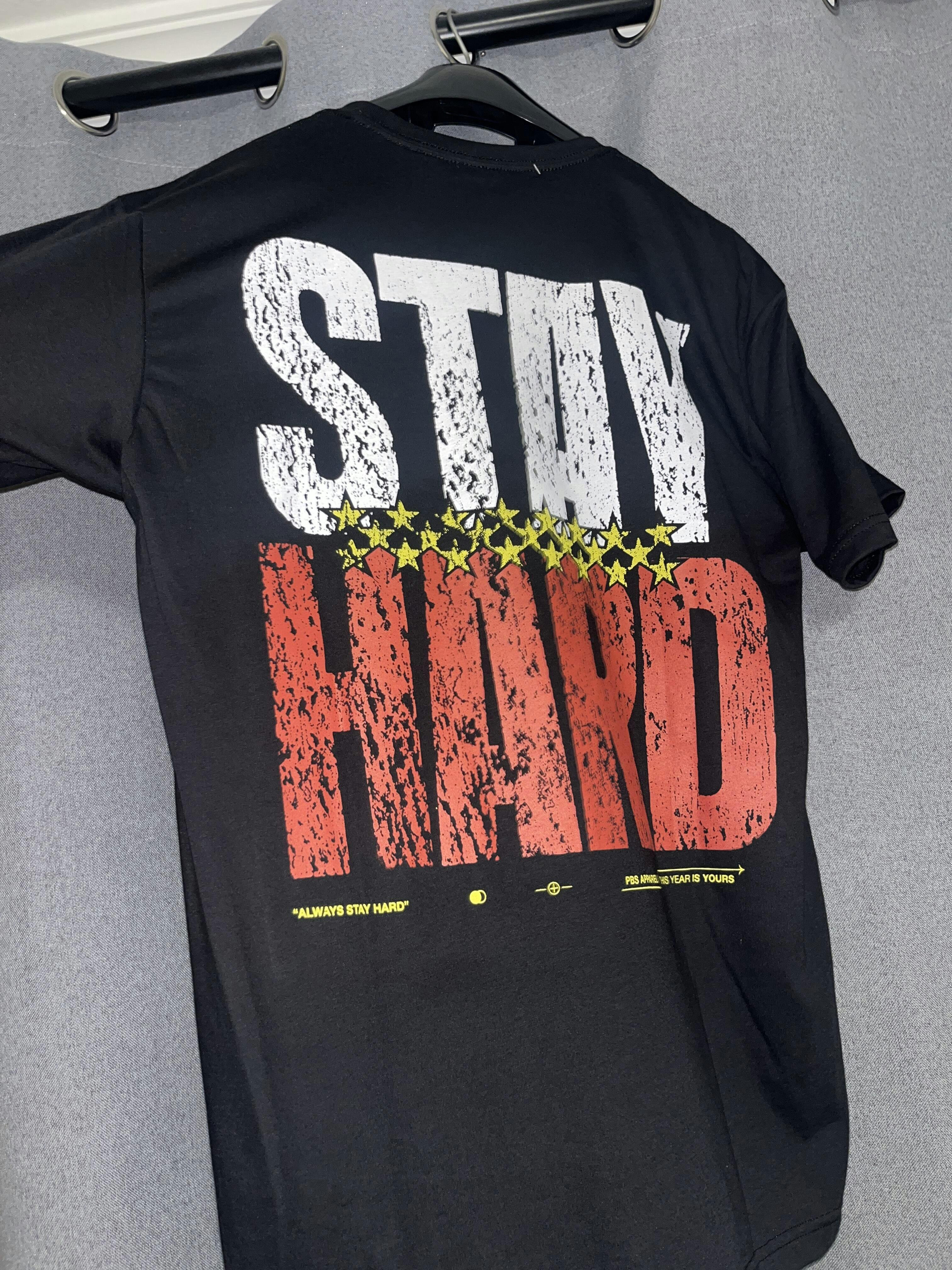 Camiseta regular fit con ajuste muscle en color negro, confeccionada en tejido elástico para un fit ceñido y cómodo. Gráfica trasera con el lema “STAY HARD” en tipografía desgastada de gran impacto, reforzada por un sutil detalle de estrellas en amarillo que aportan contraste.