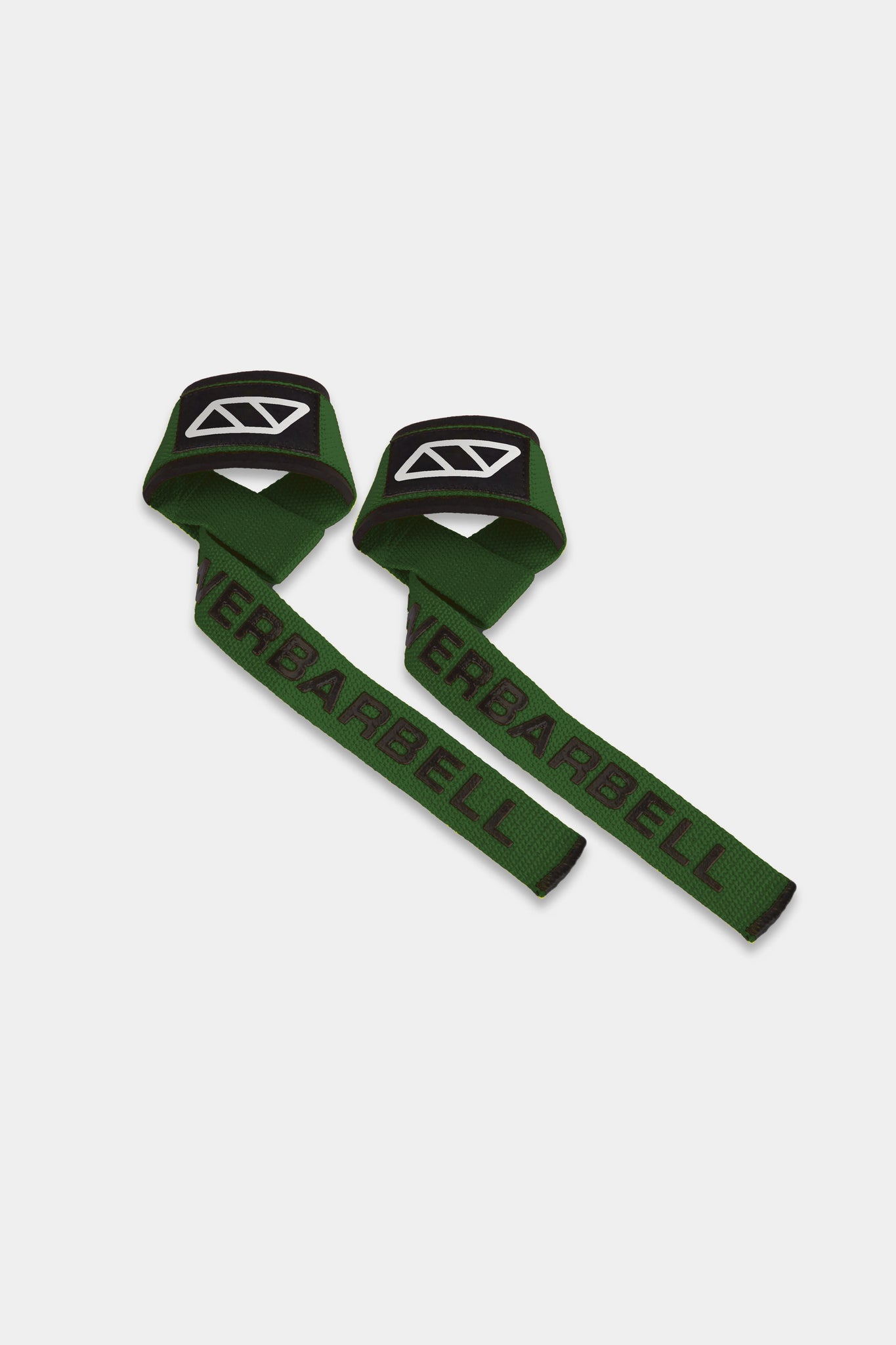 Straps para gimnasio con logotipo de POWERBARBELL en silicona y parche de PBS en el frontal de la muñeca.