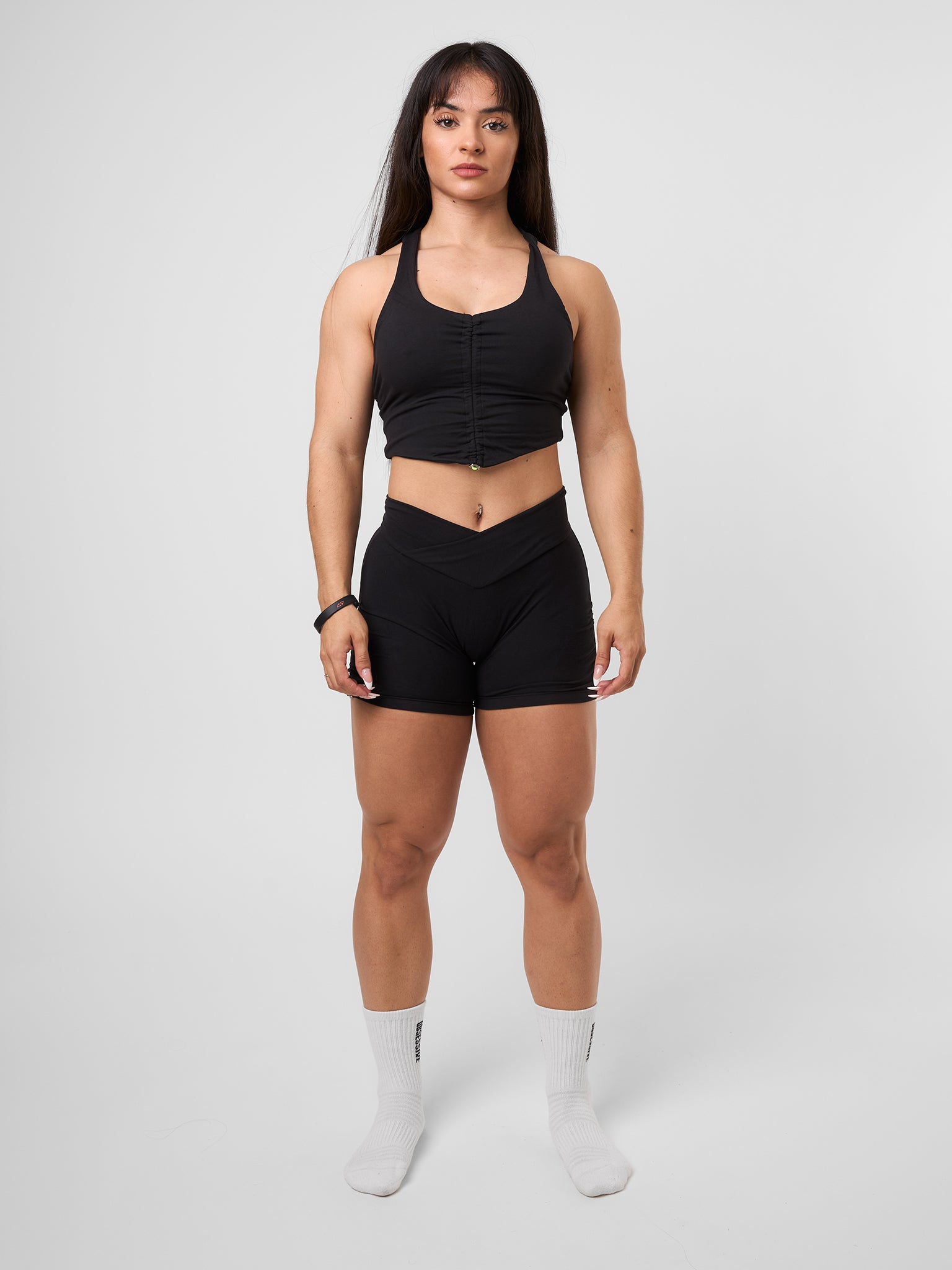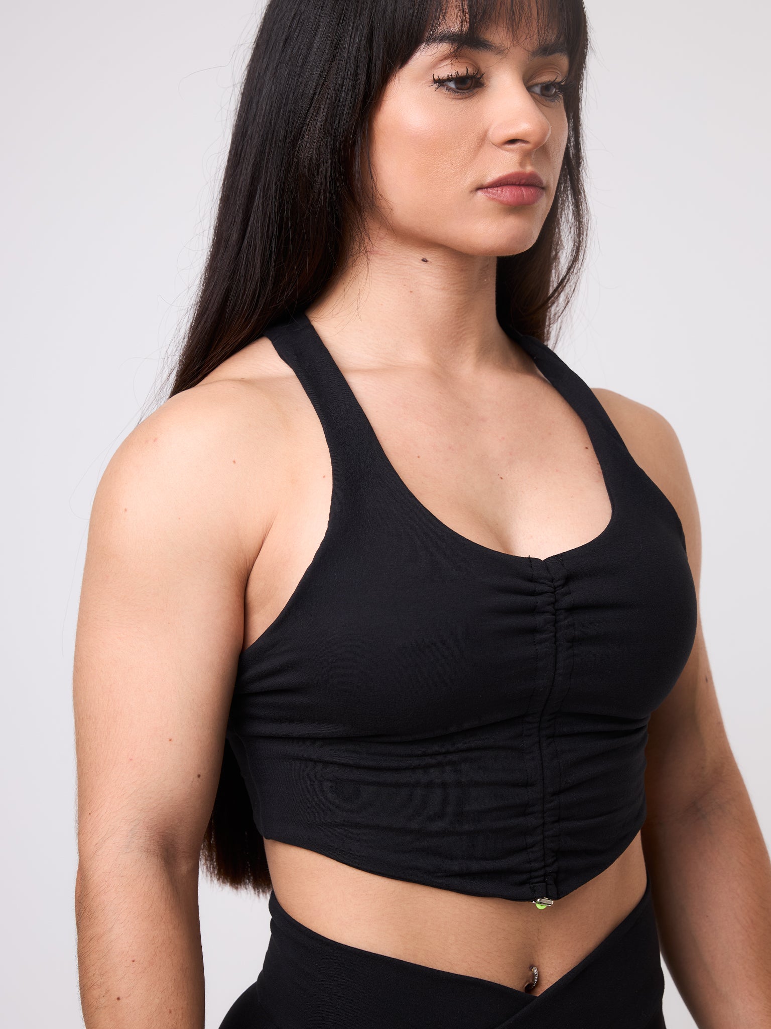 Top fitness de entrenamiento con tejido técnico elástico ideal para gimnasio. Presenta un detalle fruncido en la parte delantera para conseguir un mayor ajuste y tirantes anchos para mayor soporte y comodidad